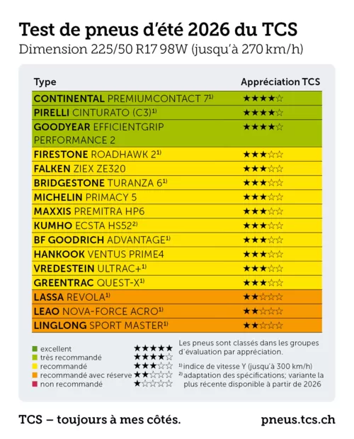 Six autres pneus manquent de peu la mention «très recommandé». Le Firestone Roadhawk2 convainc par ses qualités de conduite, mais présente des faiblesses en matière de longévité et d’abrasion. Le Falken Ziex ZE320 montre de légères faiblesses sur chaussée sèche ainsi qu’en durée de vie prévisionnelle. Le Bridgestone Turanza 6 présente de légers déficits en sécurité de conduite, mais marque des points grâce à de bons résultats au bilan environnemental.
