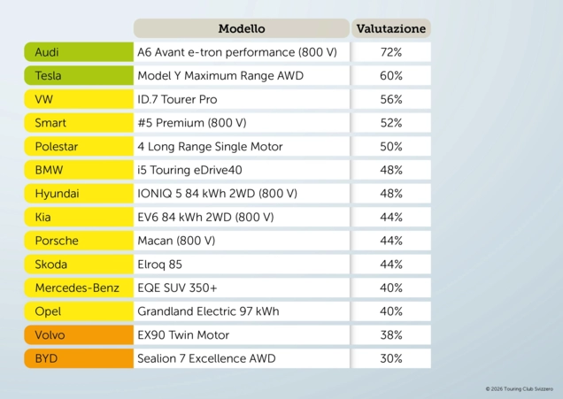 Nel test, il miglior risultato complessivo è ottenuto dall’Audi A6 Avant e-tron performance, che raggiunge 441 chilometri con una sola ricarica. I modelli meglio classificati dimostrano che un lungo viaggio invernale può essere effettuato con un numero limitato di soste: l’Audi A6 Avant e-tron e la Smart #5 Premium figurano tra i pochi veicoli in grado di raggiungere l’obiettivo con una sola sosta di ricarica di 20 minuti.